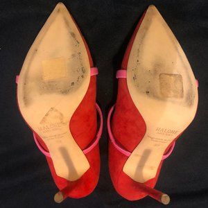 Gorgeous pair of Malone Souliers "Maureen" mule pumps in red suede with pink straps! Size EU 39. Malone Souliers is a designer brand and runs small. I usually wear a US women's Size 8 and these fit perfectly. Excellent Used Condition. Sold without box.