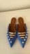 For your consideration is a pair of Malone Souliers Zelda faux-pearl embellished blue satin loafers in pre-loved condition. Size 37