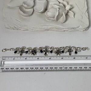 Maltese Cross Charm Bracelet - Pearls & Jet Black Beads Silver Tone Chain