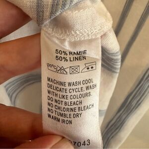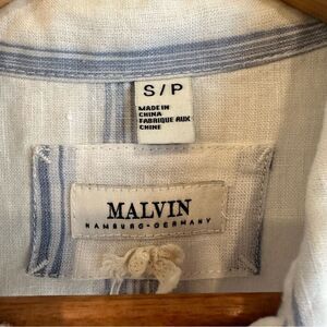 In excellent condition. Malvin from Hamburg Germany sleeveless, striped shirt dress. Mini length with a collar and buttons 1/4 down the front. Linen and ramie blend. Loose, relaxed fit. Lightweight and perfect for summer. Flat lay measurements: 19" pit to pit, 35" length.