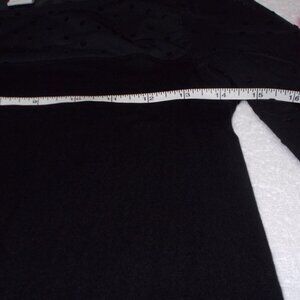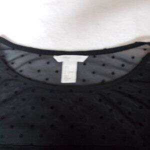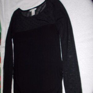 In very good condition, maternity top with sheer polka dot sleeves and collar, black top with long sleeves, chest measurement 15", 24" l, 13.5 inch waist, stretches to 18 inch waist
