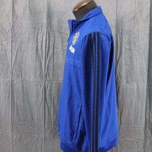 Up for sale is a Manchester United Jacket. It has a blue base colour with dark blue stripes on the arms. The front of the jacket has the Adidas logo on one side and the team logo underneath in yellow with AON underneath in white. What a great jacket do not miss out on it.
