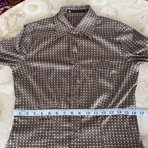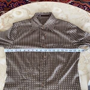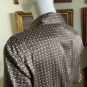 In excellent preowned condition attractive synthetic silk button down shirt features a bold all over geometric pattern in rich brown and black tones. Special design details include two small pockets at waist plus a small pocket at the chest.