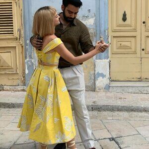 Stunning Yellow Crop Top with Silver Leaf Embellishments and Midi Skirt set worn by Violett Beane as Imogene Scott in "Death and Other Details". Custom design by Mandi Line. Worn on episode 5.