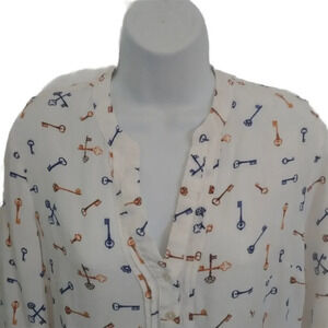 Loose fit and lightweight fabric tunic style blouse. Cream coloured with blue/gold/brown vintage key print. Open collar. 3/4 length sleeves. Rounded hemline at the sides.