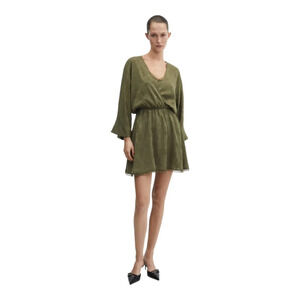 Flowy jacquard fabric. Satin. Short design. Evasé design. Crossed V-neck. Three quarters wide sleeves. Unclosed. Lace detail. Inner lining. Composition: 100% polyester. Lining: 100% polyester. Lace edging: 100% polyamide. Contains at least 70% recycled materials Designed in Barcelona [L8]