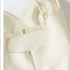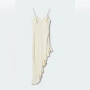 Flowy fabric, Midi design, Tailored design, V-neck, Thin strap, Invisible back zip fastening, Hook fastening on the back section, Asymmetric hem, Frill on the bottom, Open back, Inner lining.