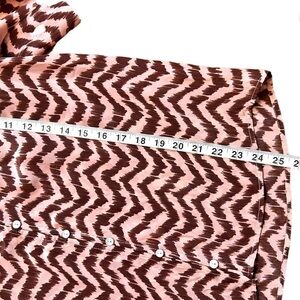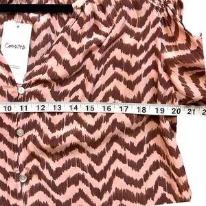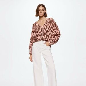 Flowy fabric. Printed design. Striped design. Two-tone print. V-neck. Long sleeve. Button fastening on the front section.