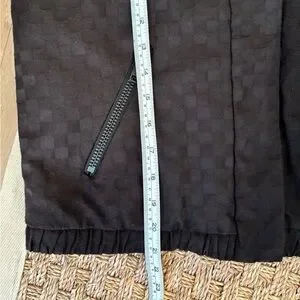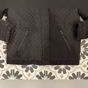 Black bomber jacket with a subtle checkered pattern. Ideal for versatile styling.