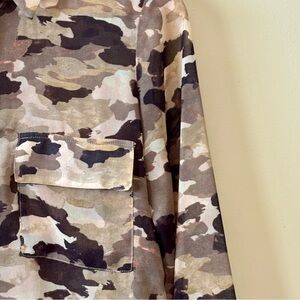 Stylish MNG (Mango) sheer, lightweight camouflage shirt with button-up front. Features dual chest pockets. Perfect for casual wear, size 2. In good pre-owned condition, laundered and ready to wear.