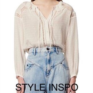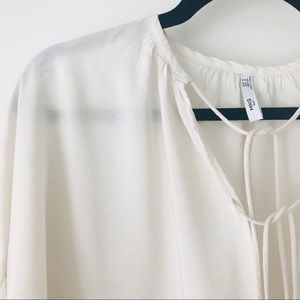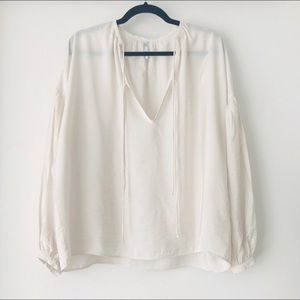 This piece is in very good preloved condition. All buttons, tied & seams are intact. No stains or marks. It really looks excellent. This blouse features drop shoulder balloon sleeve arms. Double ties in front that could be worn multiple ways. Button closure at risk. Colour | Ecru