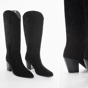 100% bovine leather. Boho style. Pointed. Tall leg. Block heel. Decorative embroidery. 6 cm heel. Festival Season.