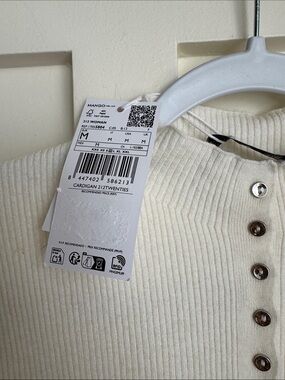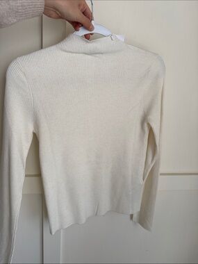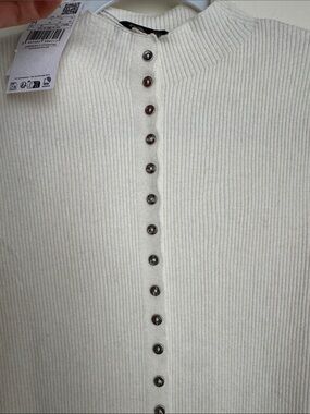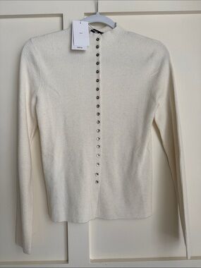 Soft ribbed wool top with a snap-button front. Clean cream color and subtle shine from metal snaps. Classic neckline and lightweight feel. Easy to layer and style.