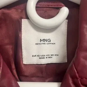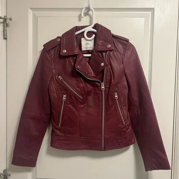 Stylish deep red leather jacket by Mango. Features zippered pockets and a sleek design. Ideal for a modern look.