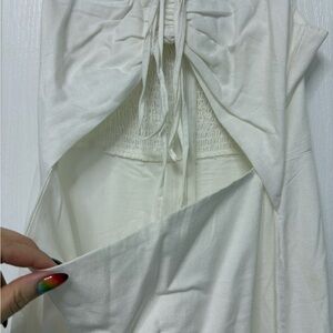 Chic backless design with spaghetti straps. Perfect for elegant occasions. Classic white color enhances style.