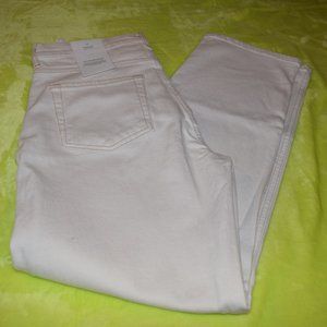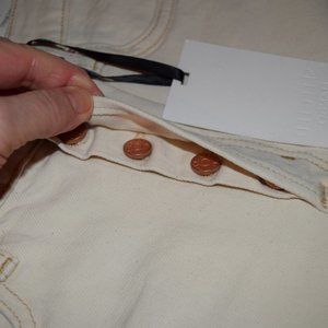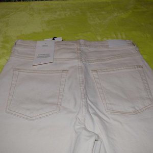 Ecru high-rise straight leg jeans.