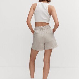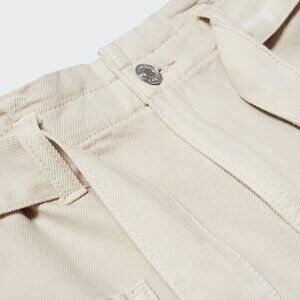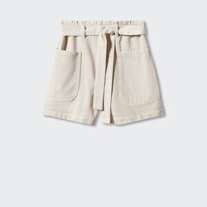 Denim style cotton fabric. Paperbag. Short design. High waist. Two patch pockets on the front. Two welt pockets on the back. Zip and one button fastening. Adjustable belt.