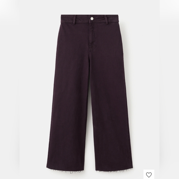 From Mango website: Denim-style cotton fabric. Long design. Wide-leg design. Crop design. High waist. Belt loops. Two patch pockets at the back. Frayed hem. Front zipper and button closure. Available Plus. Inseam 72 cm.