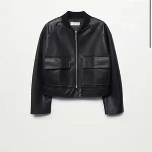 Faux leather. Short design. Straight design. Bomber jacket collar. Long sleeve. Two patch pockets on the front. Inner lining. Zip and press stud fastening.