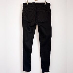 Black mid rise jeans. Stretch denim. Classic five-pocket style. Slim silhouette.
