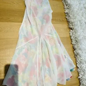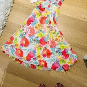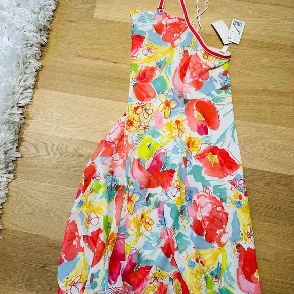 Vibrant backless dress. Features multicolor floral print. Adjustable straps. Perfect for summer.