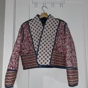 Chic jacket with intricate patterns. Features red, cream, and blue hues. Stylish and versatile. Never worn, new without tags