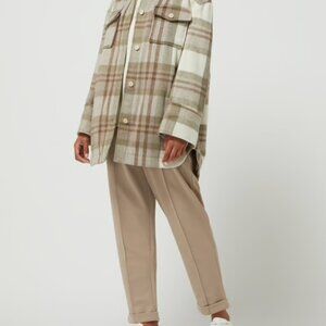 This MANGO shirt jacket is made from a blend of recycled polyester and viscose. It features an oversized check pattern, dropped shoulders, and flap pockets.