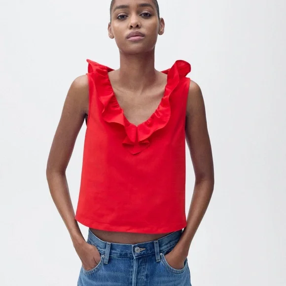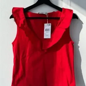 Elegant red sleeveless top with a stylish ruffled neckline. Perfect for any occasion.