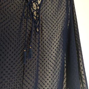 Mango Sheer Swiss Dot Ruffle Tie Blouse, Navy Blue , Size US6