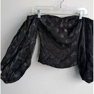 Mango Shiny Black Velvet Polka Dot Off-Shoulder Puff Sleeve Top