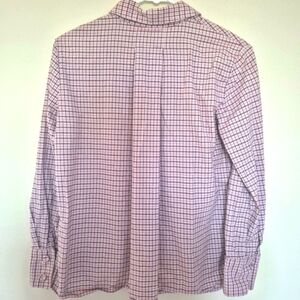 Features a soft pink plaid fabric with a collared neckline, fabric-covered buttons down the front, and two-button cuffs. Tailored for a classic, preppy look—perfect for the office or styled casually. Great used condition, no notable flaws.