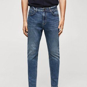 Tapered fit: wide cut at the top that narrows from the knee to the ankle. Denim style cotton fabric. Cotton and lyocell blend fabric. Dark wash. Loops. Zip and one button fastening. Five pockets. The model is wearing a dark blue jean in a size 42.