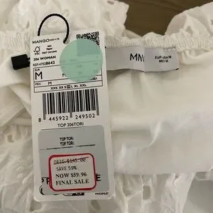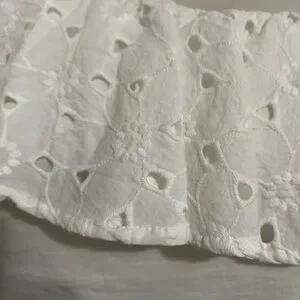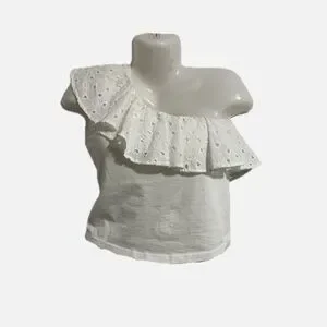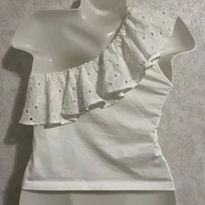 Chic one-shoulder design with eyelet ruffle. Perfect for stylish outings.