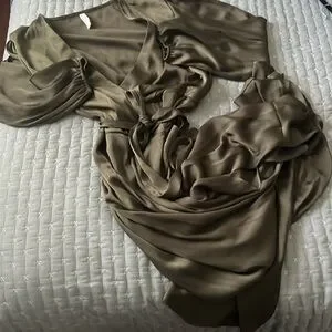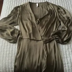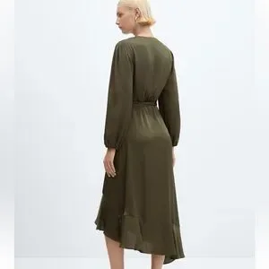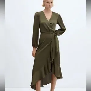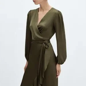 Fluid fabric. Satin finish. Midi design. Wrap detail. Evasé design. V-neck. Long sleeves with elastic cuffs. Ribbon on the waist with tie closure.
