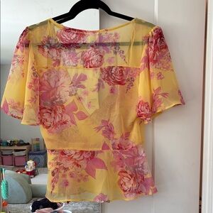 Elevate your style with this Mango “Romance” blouse, featuring a vibrant yellow hue adorned with delicate pink floral prints. The flutter sleeves and wrap design create a graceful silhouette, while the pleated details add a touch of elegance. Perfect for adding a romantic flair to your wardrobe.