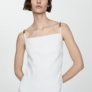 Flowy fabric. Long design. Tailored dress. Sleeveless. Thin straps. Metallic detail. Invisible lateral zipper fastening. Perfect for a wedding or vacation. Wear strapless or with gold straps. Size 4/small. Worn once