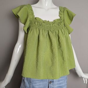 Mango women's top Peasant Texture blouse Green flowy ruffled S