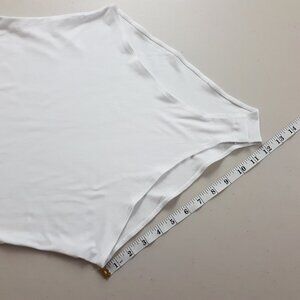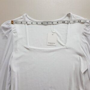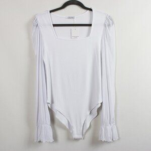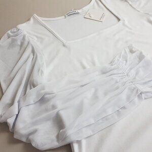 A lightweight bodysuit in an elegant white shade. The material is stretchy and a bit see-through so it’s best worn with a neutral tone bra. It has puff sleeves and ruffled cuffs made with delicate mesh fabric. Note*: Hand wash is recommended as the sleeve material is too delicate for washing machine. Perfect for summer. New with tag. Great condition.