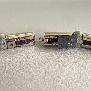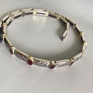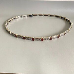 Authentic Women's Manni Designer Belt, crafted in Italy, circa 1980, Stamped Brass, with rhodium silver plating, intricate scrollwork rectangular panels with red flat cabochon spacers, interlock lock closure, fits waist sz "32" waist, belt total length 34", nonadjustable, not stretchable. Has a little oxidization on a few of the cabochon metal housing as pictured. In good vintage condition.