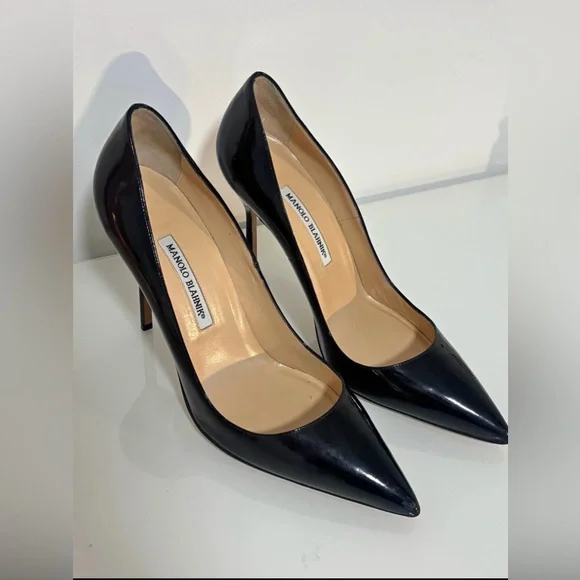 Classic Manolo Blahnik black patent leather pumps. Pointed toe, high heels. Great for dressing up any outfit.