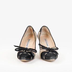 Manolo Blahnik Beige and Black Suede Bow Accent Pumps