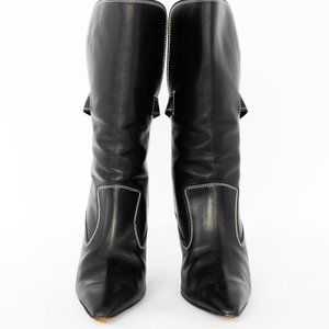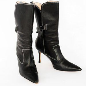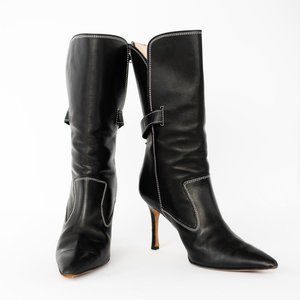 Description: Black leather Manolo Blahnik Bretagne pointy toe boots with white stitching Condition- Very good, wear to soles Colour: Black Material: Leather Size: 39 (fits smaller, please know your size in this brand prior to purchase) Heel Height: 3.5" Estimated Retail Price: $1350