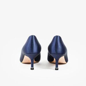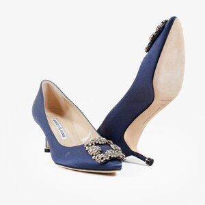 The epitome of luxury, the stunning Manolo Blahnik Hangisi pumps feature a navy satin upper, an almond toe, a 40mm stiletto kitten heel, leather soles and lining, and the signature crystal buckle encased in a gunmetal frame.