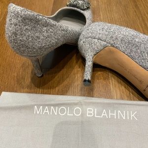 MANOLO BLAHNIK Hangisi Jeweled Pointed Toe Pump Size 39 1/2 A sparkling brooch illuminates the pointy toe of an exquisite stiletto pump cut with a subtly curvy topline that flatters the foot 3 1/4" heel Textile upper/leather lining and sole Made in Italy Dust bag included! 100% authentic