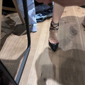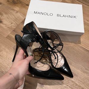 Leather Manolo Blahnik pointed heels with ankle strap/lace up detail. Beautiful shoe, super flattering but unfortunately too small on me :(. Worn a couple times but overall in good condition. Some wear in the heel as shown in the photo.