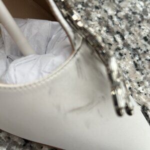 White / Ivory Manolo heels that have never been worn. The bottom was wrapped in 3M by my husband. These were originally supposed to be my wedding shoes, but they just slipped off too much and I didn't want to risk it. There is a little black scruff under the embellishment of one of the heels, not sure how it occurred but I was told it can be cleaned if we brought it into the store.