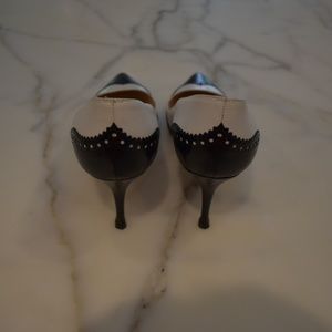 Used, Black and white two-tone pointed toe pump detailing caps the pointy toe and traces the topline of a patent-leather pump that easily transitions between office and after-hours looks.