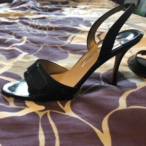 Classic black sandals. Almost 4”. Good condition. A bit of wear on the bottoms (in photo). Slight scuff left toe (in photo) may need to zoom to see.(barely noticeable)