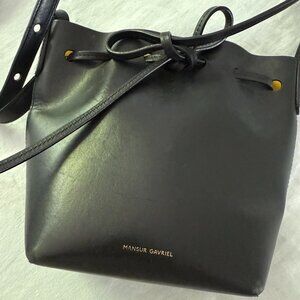 Authentic Mansur Gavriel Mini Bucket Bag in Black/Gold. Genuine vegetable tanned leather, structured construction. Adjustable strap up to 7 custom lengths. Open top is cinchable to liking.
