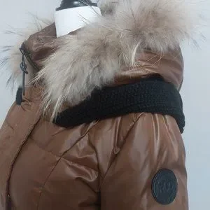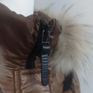 Magnifique manteau ayant un capuchon de laine noir fixé en permanence derrière le capuchon arborant une belle fourrure. Les poignets sont également fait de laine noir. L'état est impeccable ormis le bout des zipper qui est légèrement écailles. Super confortable et juste assez chaud en saison hivernale.